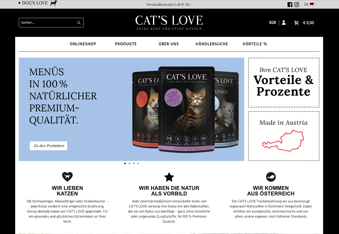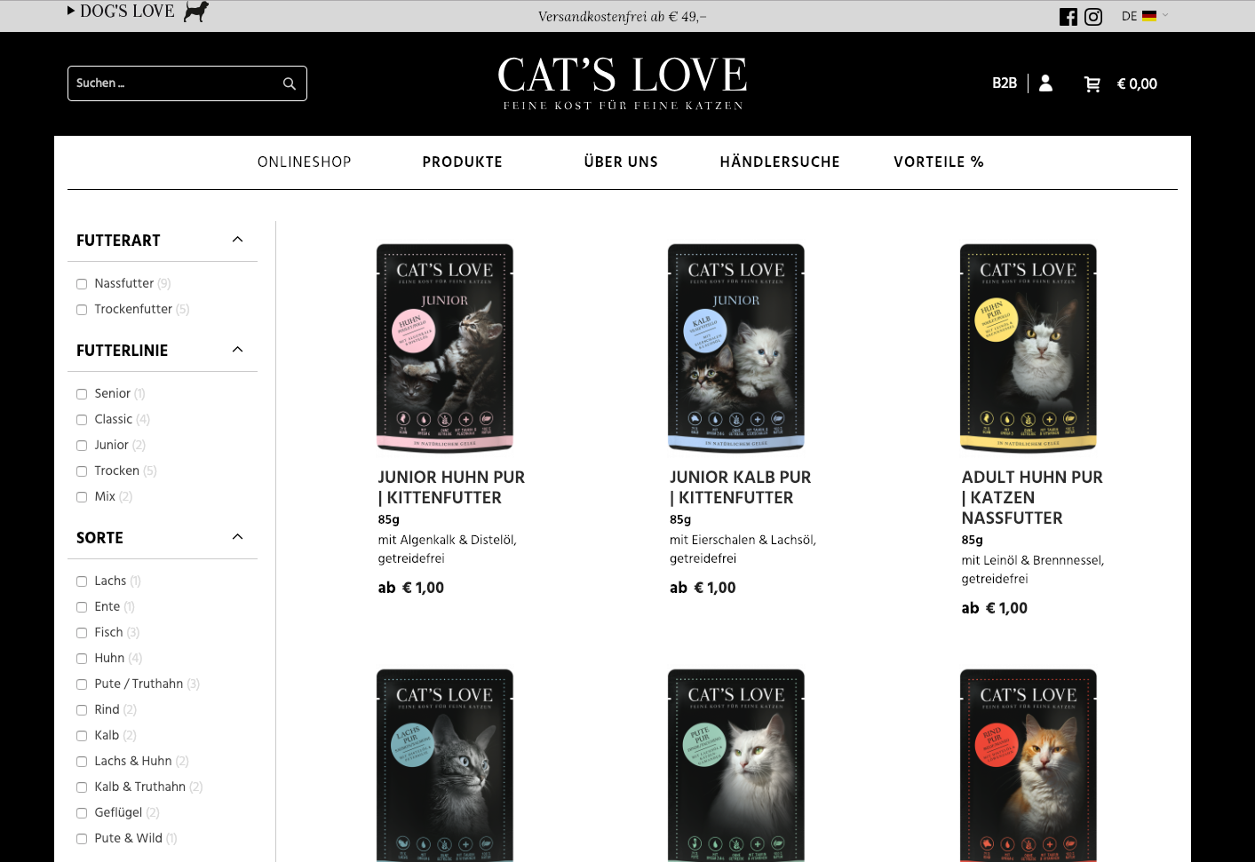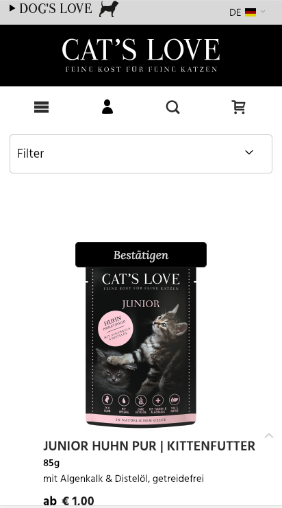 Magento2-Webshop für Cat's Love. Programmierung inklusive Support und Weiterentwicklung, Suchmaschinenoptimierung, Performanceoptimierung,... Verfügbarkeit in 4 Sprachen.