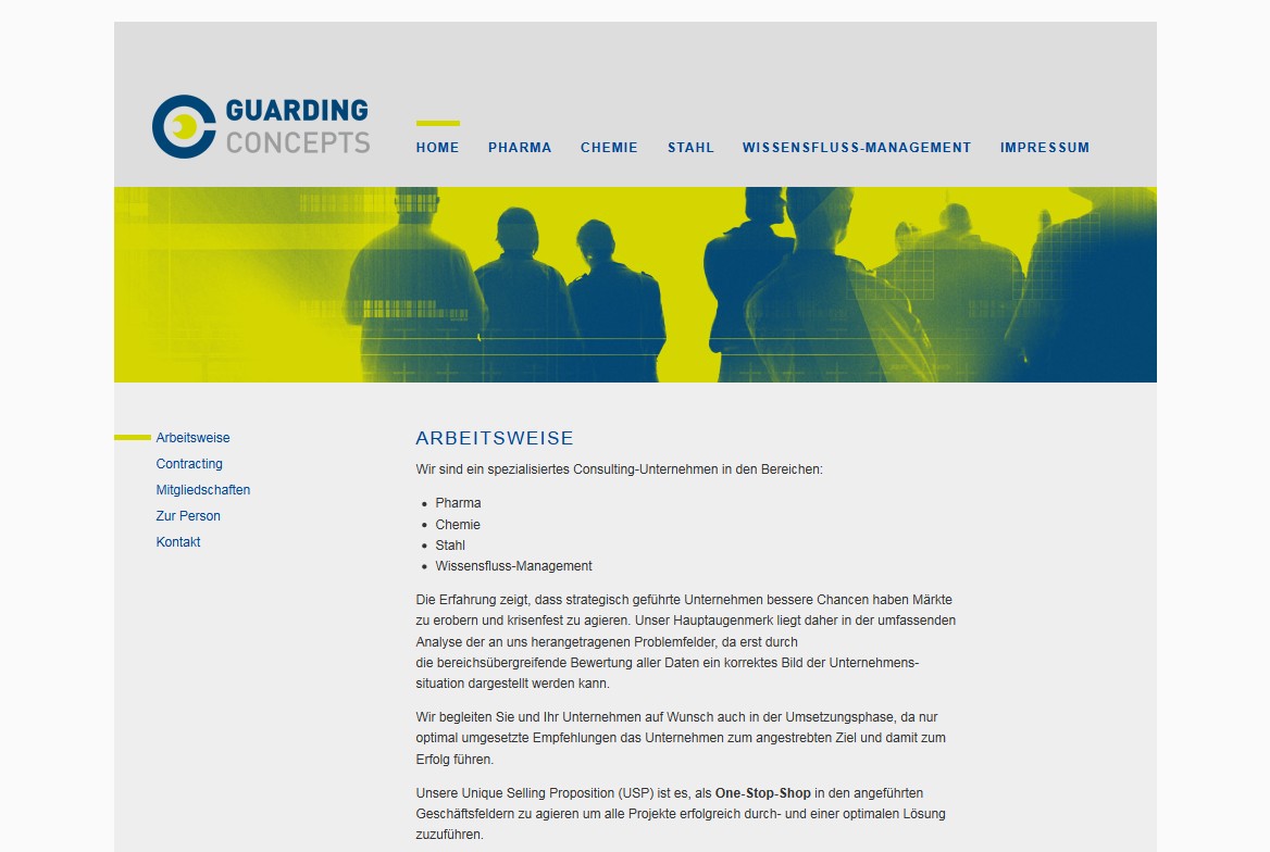 Guarding-Concepts war ein Wiener Anbieter von Bewachungs- und Sicherheitsdienstleistungen, der sich an Auftraggeber:innen aus Gewerbe, Veranstaltungswirtschaft und öffentlicher Hand richtete. In einer Branche, in der Verlässlichkeit, Diskretion und schnelle Erreichbarkeit mehr zählen als glänzende Imagekampagnen, war die Website kein Selbstzweck, sondern reiner Erstkontakt: Wer in Wien kurzfristig Objektschutz oder Veranstaltungssicherheit suchte, sollte Guarding-Concepts ohne Umwege finden — und sofort verstehen, was angeboten wird und wie man jemanden ans Telefon bekommt. Genau auf dieses einfache Versprechen war der Auftritt zugeschnitten.