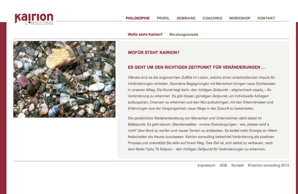 - Sechs Hauptbereiche (Philosophie, Profil, Seminare, Coaching, Vorträge, Presse) mit neun thematischen Coaching-Unterseiten